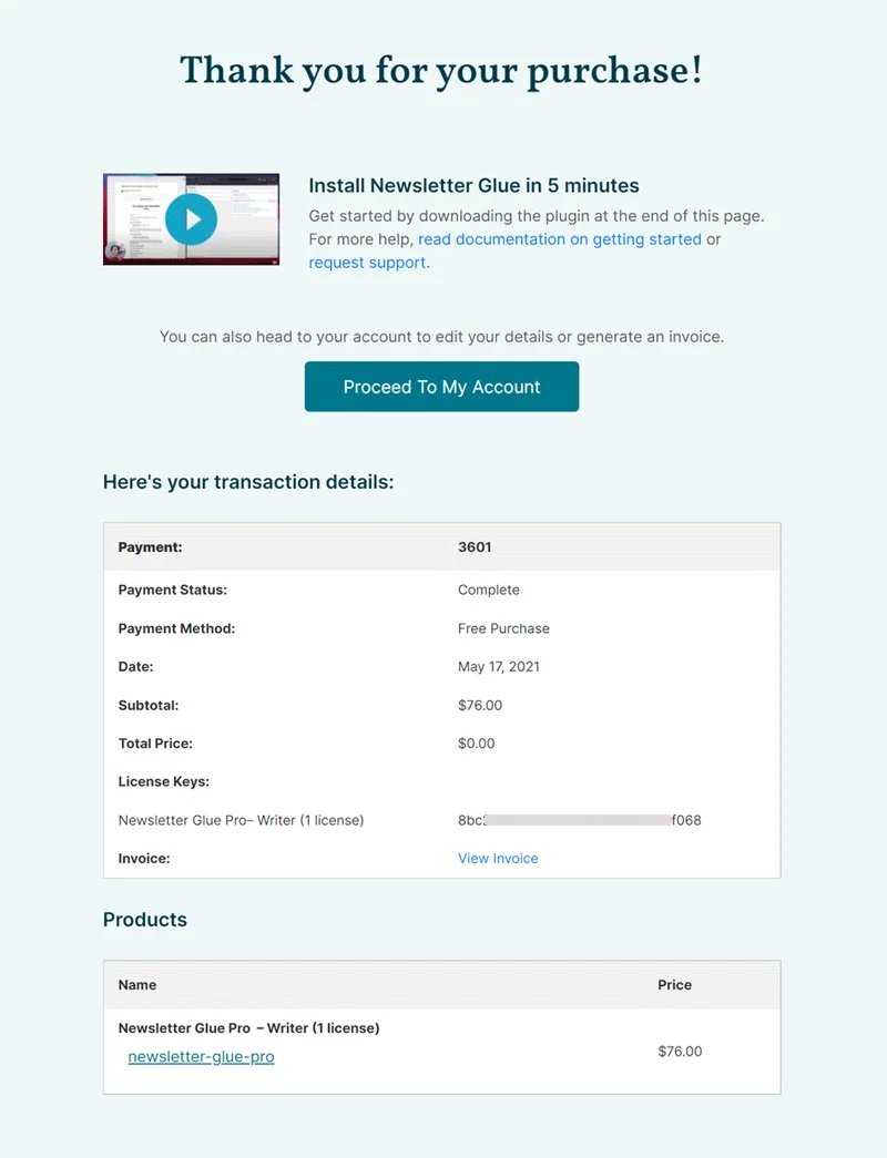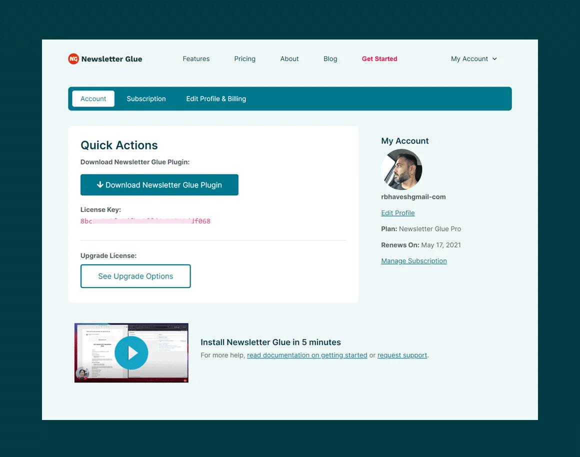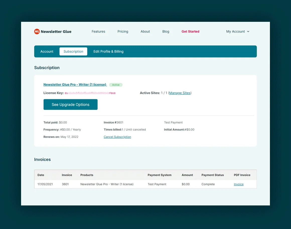Since Newsletter Glue has one product, we wanted a very simple and user-friendly dashboard. However, the shortcode provided by EDD was useless for the kind of layout we wanted. So we wrote custom code and got the data in the way we wanted. There were several iterations but eventually, we finalized something very like this.
