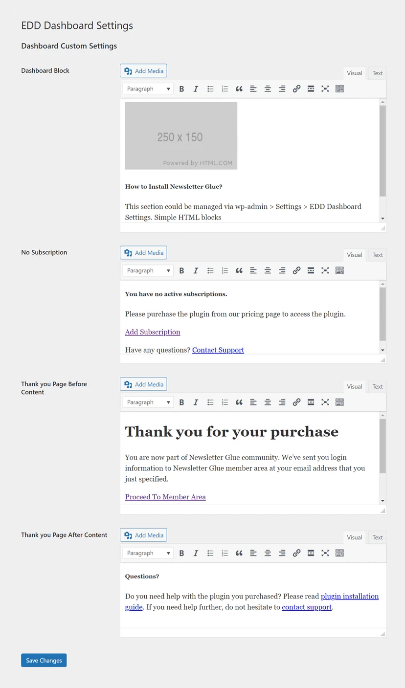 However, this is not easily accomplished in EDD as very little template help for the member area was available. So we created two separate blocks which were accessible in wp-admin > settings > ___. Here, Lesley was able to customize everything she wanted. Since she is a programmer herself, we kept HTML blocks there so she could play with them the way she wants and achieve any kind of section design she want.